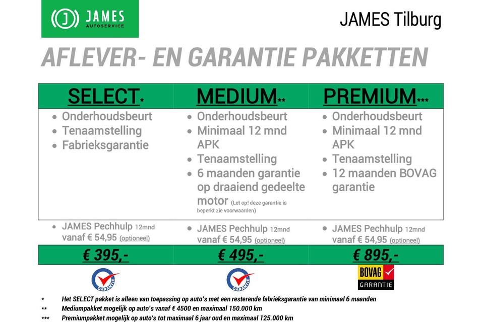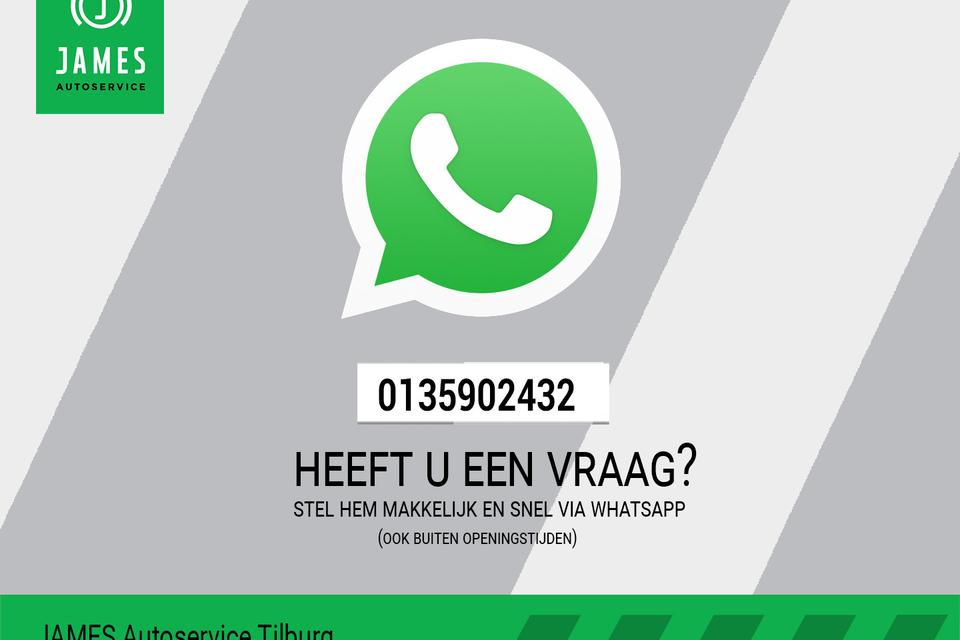 Bel voor meer informatie 013 590 2432 (ook WhatsApp). JAMES Autoservice Tilburg is al meer dan 30 jaar een begrip in TILBURG en omgeving. Kijk voor meer informatie over ons bedrijf, ons aanbod auto's en meer foto’s op onze website WWW.JAMESTILBURG.NL. Informeer naar onze aflevering- en garantiepakketten vanaf 395 euro. Alle moeite is genomen om de informatie in deze advertentie zo accuraat en actueel mogelijk weer te geven. Er kunnen echter geen rechten worden ontleend aan fouten in opties & accessoire lijst.